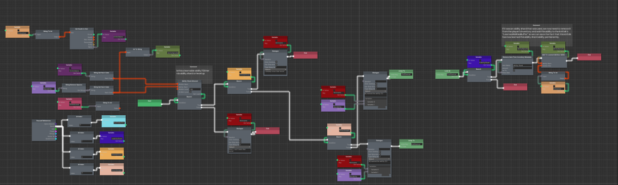 Here's a before and after of our dialogue graph that plays when learning a new ability via an ability shard or leveling up. Believe it or not, these two graphs do the same thing!